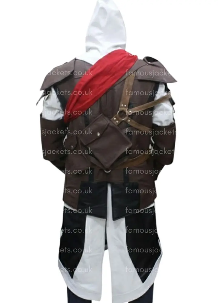 Padded out of high quality faux leather and cotton this Assassin Creed IV coat has a white, brown and black color way with red details. We present a long hooded coat that also has an armor style vest, front opening with cross belts, full length sleeves which include arm guards and a back harness which also has a utility pouch for that extra touch of realism. The included hood and the standard cosplay fit gives comfort which at the same time preserves the classic Assassin Creed look. Perfect for cosplayers, film theme events, and costume parties this Edward Kenway coat is durable, stylish, and true to the brand for all fans.