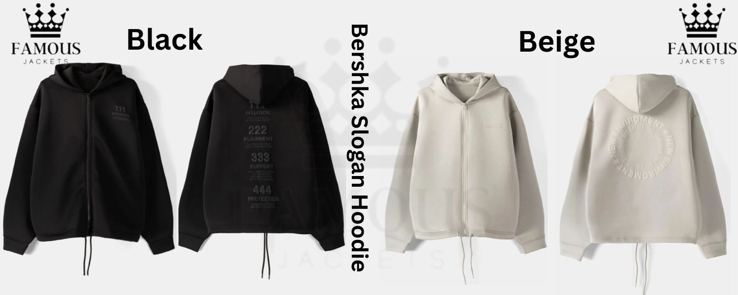 This is the Bershka Zip-Up Slogan Hoodie, a trendy and unisex hoodie designed for cuddly leisurely wear. A soft fleece is constructed for warmth without the heaviness, and the hooded-collar style achieves a playful casual profile while the zip-up closure allows for easy layering. Rib-knitted cuffs are designed for a snug fit, and this style of cozy hoodie is available in classically adult beige and black, an essential in every wardrobe. It gets you outside and at home with a blend of form and function that doesn’t make a difference.