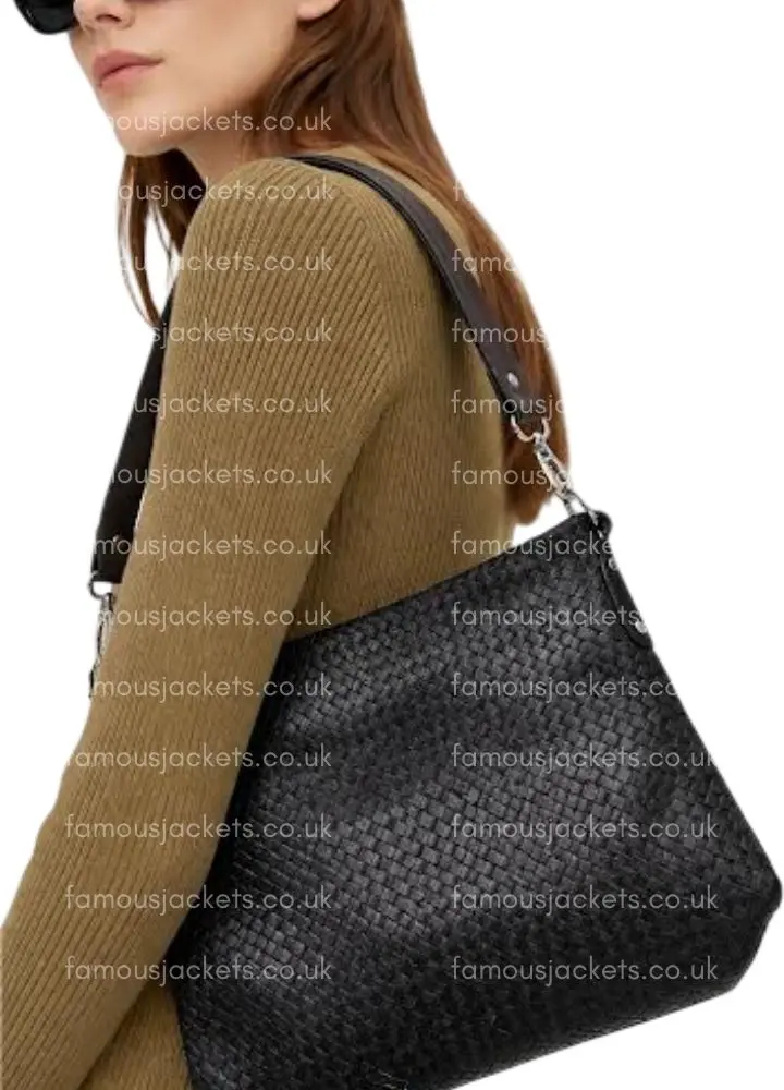 The Black Leather Woven Bag matches both casual and dressy outfits, making it a versatile accessory for everyday wear.