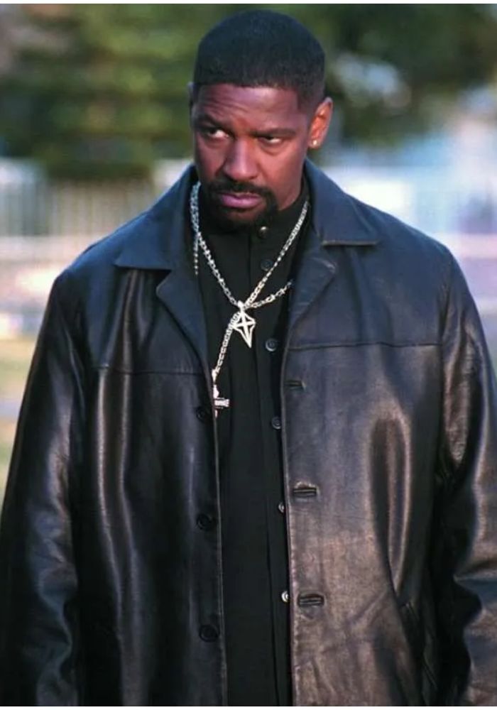 The Black leather “Training Day” coat that Denzel Washington wore as Alonzo Harris in the film is a product of the role. Made from real leather, this black leather coat is a picture of authority and style. It has a viscose lining for comfort, a button front closure, and a classic lapel, which brings out its timeless appeal. The black color gives it a very sharp look, which also adds to its sleek design, while the full-length sleeves with buttoned cuffs and many pockets not only add functionality but also a sharp appearance, making it a must-have for fans and fashion enthusiasts.