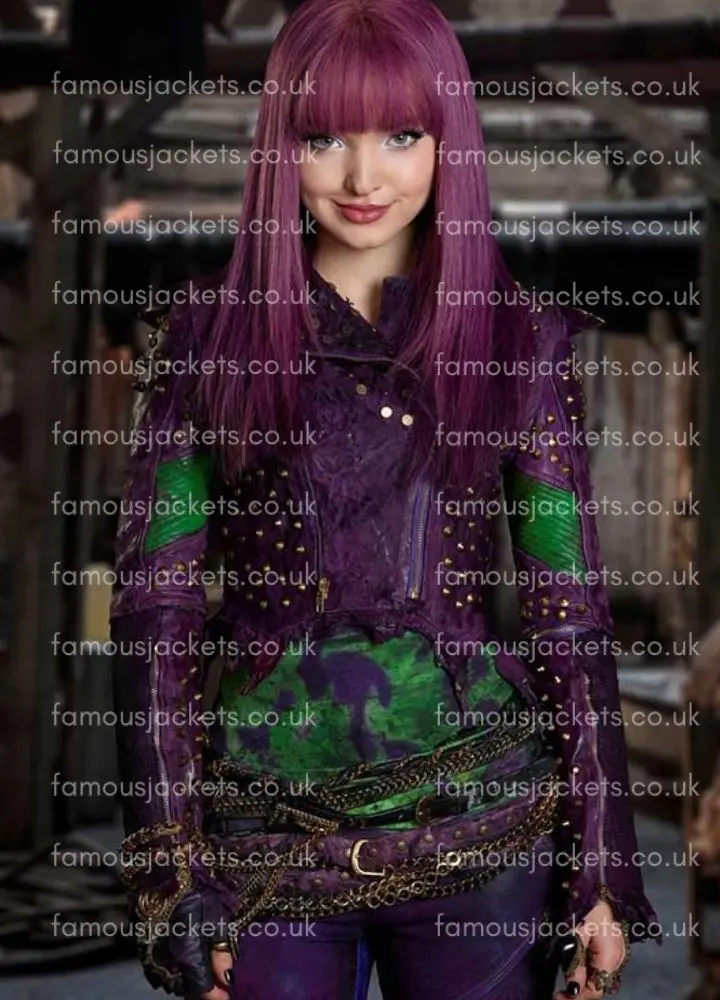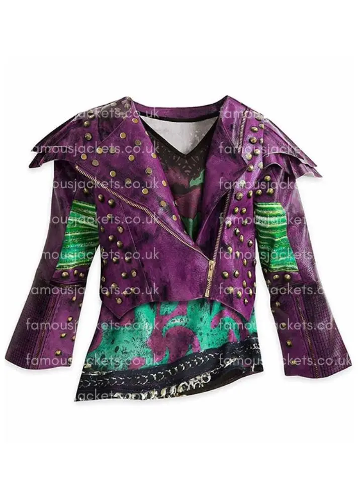 Step into the world of Auradon with this Disney Descendants 2 Dove Cameron Mal Studded Jacket, which is a perfect replica of the outfit that Dove Cameron wore as Mal in the movie. In Disney Descendants 2, Mal steps out in classic edgy and confident style, and this Mal Purple Studded Leather Jacket does just that – it beautifully captures her rebellious yet very stylish persona. For fans looking to relive the memories of the film’s iconic scenes, this Descendants 2 Outfit brings the magic of the movie to your wardrobe for use at cosplay events, Halloween parties, or as everyday fashion with attitude.