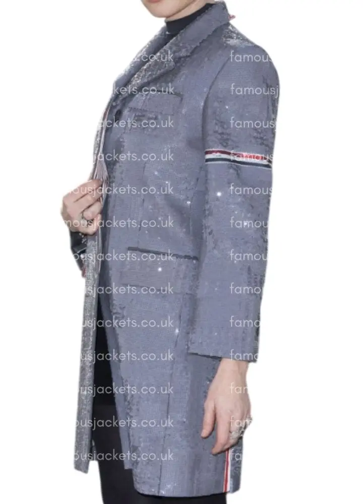 Step into the Dune 2 universe, a fantastic setting which plays out the tale of Arrakis, political play and interstellar adventure. In this blockbuster follow up, Rebecca Ferguson once again takes on the role of Lady Jessica, a character known for her strength, poise and dominant air. We present to you the Dune 2 Rebecca Ferguson Lady Jessica Grey Coat which captures the essence of her screen persona. This grey sequin coat brings the film’s amazing costuming to your wardrobe. It puts a piece of Arrakis in your own collection. Whether for a themed event, cos play, or just to make a bold fashion statement, this Rebecca Ferguson Coat is the embodiment of Lady Jessica’s style in Dune 2.