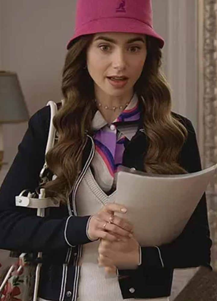 Emily Cooper, Emily In Paris Lily Collins, Navy Blue Piped Jacket