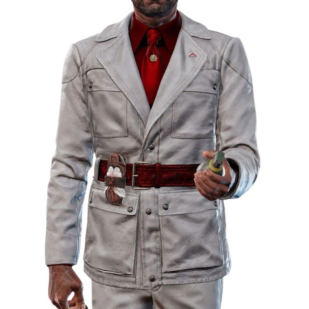 This is the Giancarlo Esposito Leather Coat which we have made from either premium faux or real leather at your choice of comfort or luxury. We’ve included a soft viscose lining that provides warmth and great breathability for all day wear. The Giancarlo Esposito White coat has a sharp lapel style collar, full length sleeves and open hem cuffs which present a structured but laid back fit. In white for an elite look which also plays into the casual and semi formal wear, this Far Cry Anton Castillo Coat also keeps the game inspired theme which is a signature.