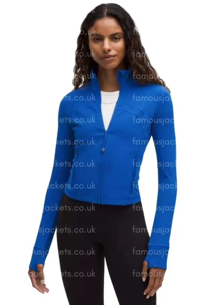 The Lululemon Define Jacket in this cobalt shade fits like a glove, offers amazing stretch, and stands out as a stylish wardrobe essential for active women.
