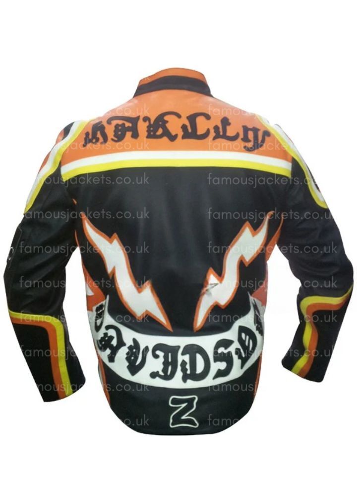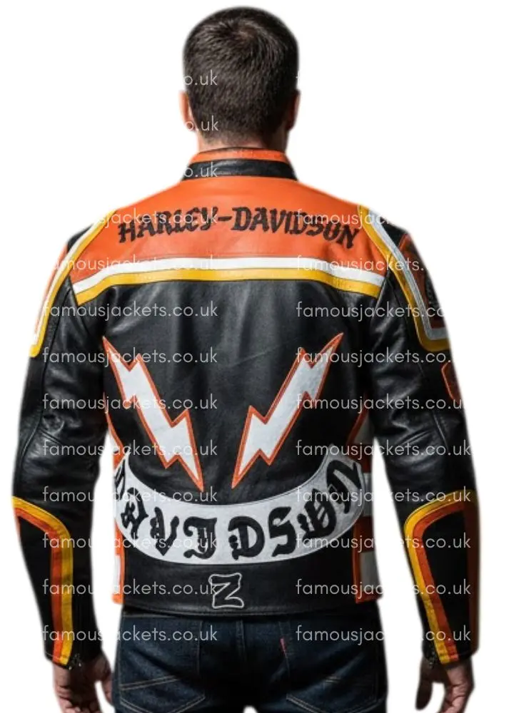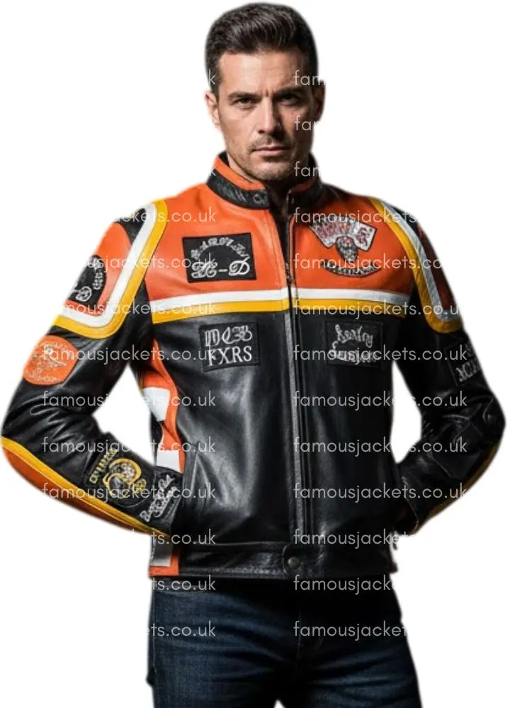 The HDMM Mickey Rourke Motorcycle Jacket is a statement jacket for any motorcycle enthusiast. With real and faux leather combined, the durability and comfort it gives outcome from the good quality lining. In modern design, this buttonless design comes with details through buttoned-up tops and has a YKK-branded zipper for built-in style and longevity. It comes with bold orange and black colors featuring white and yellow stripes and eye-catching patches that give it a unique character. Zippered cuffs, double buckle detailing on the sleeves, and precision stitching add up to the refined finish of the motorcycle lifestyle.
