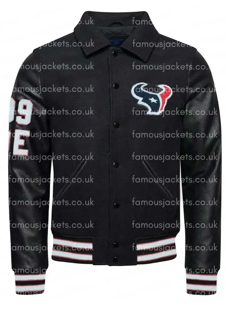 The J.J Watt Texans Varsity Jacket is an excellent combination of sporty design and classic comfort, which we put together for the fan that has an eye for fashion as well as function. We went with wool for the body and leather for the sleeves, which at the same time gives durability and a high-end feel. We included a soft viscose lining, which gives all-day wearability, making it great for casual dates, the game go’round, or an evening out. Also in this jacket, we included two outside and two inside pockets, which adds that practical touch for your everyday items. We went with full-length sleeves that open at the hem with faux fur, which at the same time adds to the style of the piece. Also, we have a stand-up collar, ribbed cuff, and snap button closure,e which all come together for a close fit. Also available in black, this jacket is very versatile and will go with jeans or joggers.