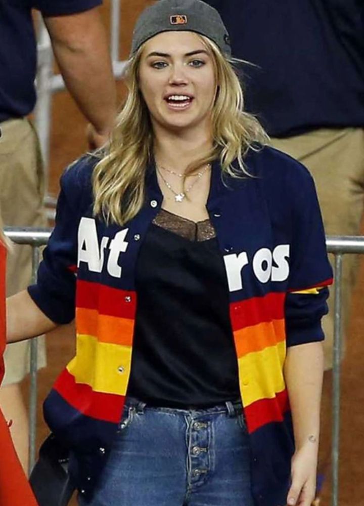 Match the “Astros Jacket” with some dark denim and that classic cotton white tee, and you will have such a chic, casual outfit. The fleece plus rib-knitted cuffs and collar surely make the outfit sporty while adding some fashion appeal to it. For that extra element of flair, sport some cool athletic shoes or even sneakers to the ensemble: truly keep those Astros athletic spirits up. You can also layer the jacket against a button-down shirt and chinos and pair them with a belt to achieve a pretty smart-casual look for most occasions. The inside and outside pockets also come in handy for keeping your stuff organized while on the go. The “Kate Upton Astros Jacket” won’t just be comfortable for you; it’s also going to turn heads with its very stylish design while paying homage to the Astros.