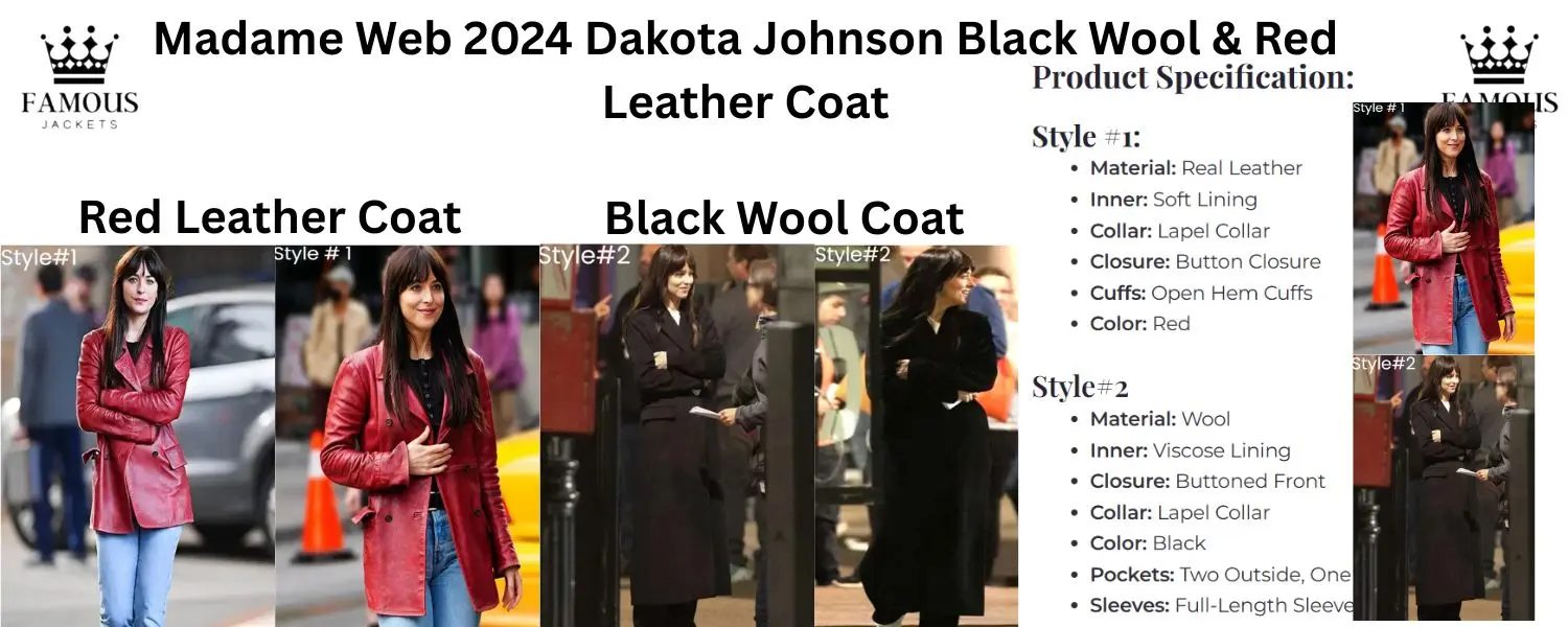 The Madame Web 2024 Dakota Johnson Coat is a fashionably versatile piece of clothing; it combines luxurious materials and sleek design. It fits fashionable people. The first is made from a mix of real leather and faux leather. This is quite sturdy and gives a classy look. It has a soft lining for comfort, a lapel collar for a refined look, and a button closure for fit. The red-colored hue can bring on a bold statement look. The second is quality wool with viscose-lined comfort and freshness. A Lapel collar with a button-front fastening is seen. This outfit is a classic silhouette because of its black-colored tones; however, it still embodies elegance due to two outer and one inner pocket for ease of use. The long sleeves make this coat look the most elegant. It could be used on various occasions.