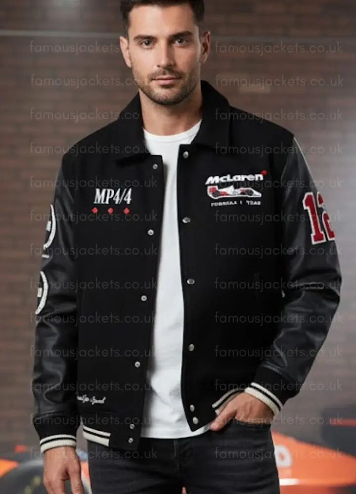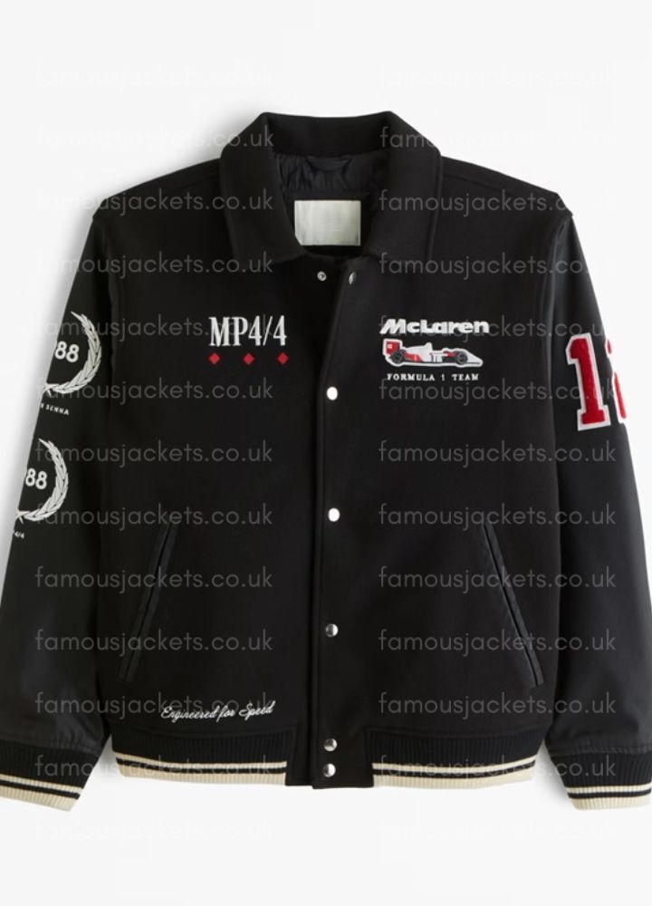 This McLaren Formula 1 Racing Jacket heats up some wool with leather sleeves to form a sleek durable design. Its soft inner lining will keep you comfy in this, while the button-front closure gives you a polished finish. A perfect black bomber jacket for men, women, and generic; The Mclaren bomber jacket has a classic shirt-style collar and rib-knitted cuffs.