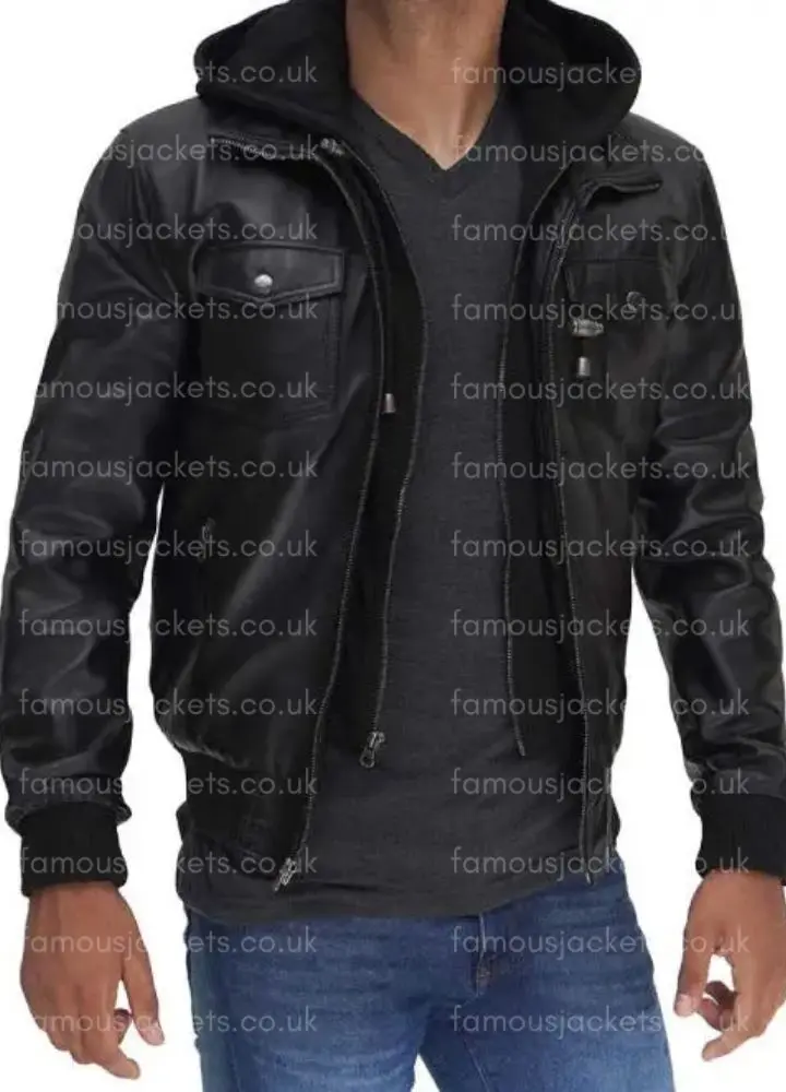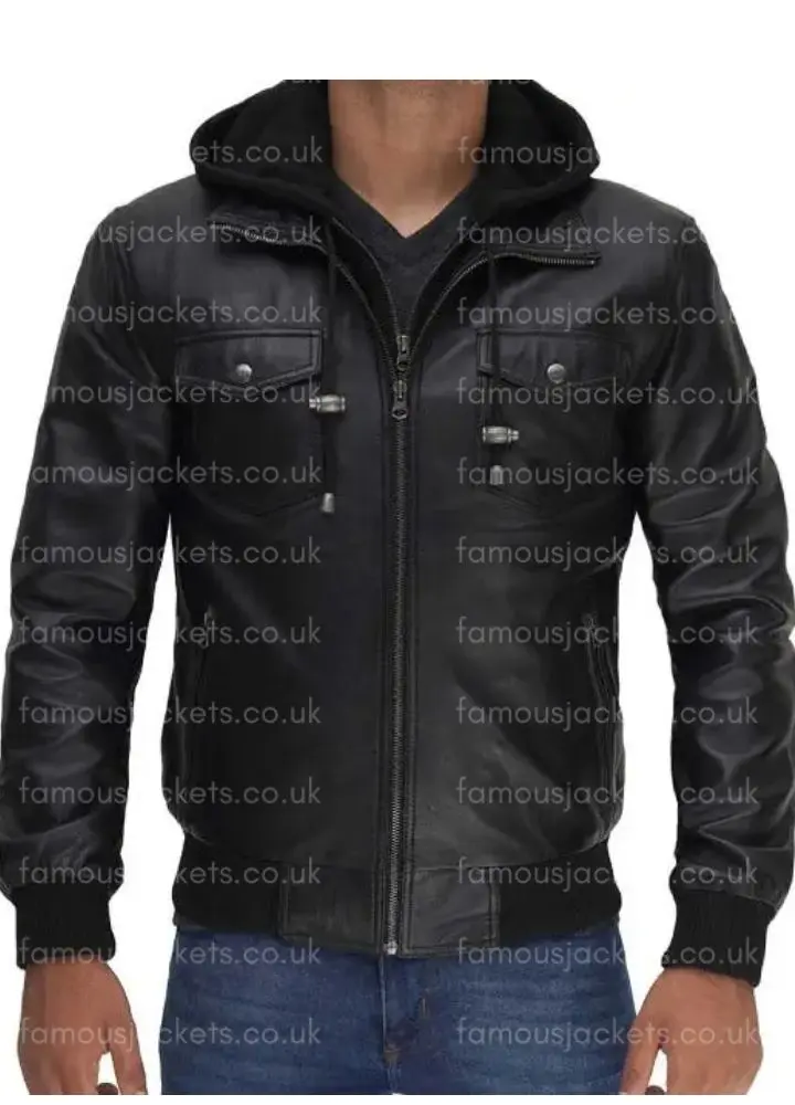 A perpetual style staple, it is a comfortable yet durable leather outerwear piece. The Men’s Hooded Leather Jacket was built for versatility; thus, it comes in either fine real leather or faux leather and has a soft polyester fleece detachable hood to keep you warm! Black hooded leather bomber jacket with refined YKK smooth zipper closure, drawstrings on the hood, and both fashion and function are four outside pockets and two inside pockets. Perfect for any occasion, the black leather jacket with hood has a sleek black exterior with a grey hood. For its own longevity, wipe it down gently with a damp cloth as machine washing is prohibited.