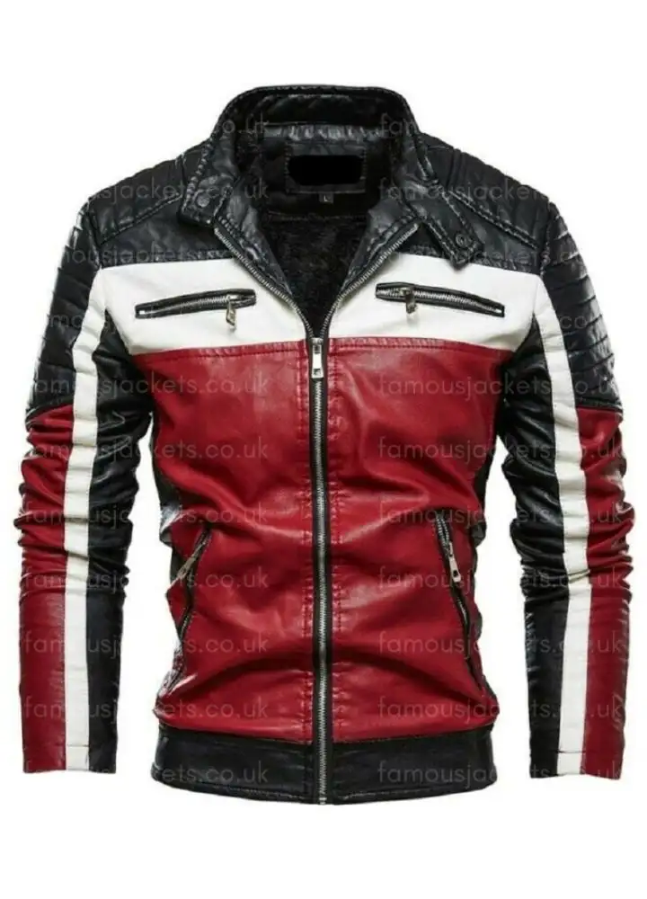 This Men’s Black, White, and Red Slim Fit Leather Biker Jacket fits perfectly and feels extremely comfortable for casual outings.