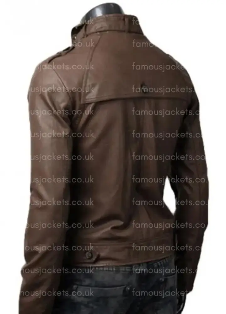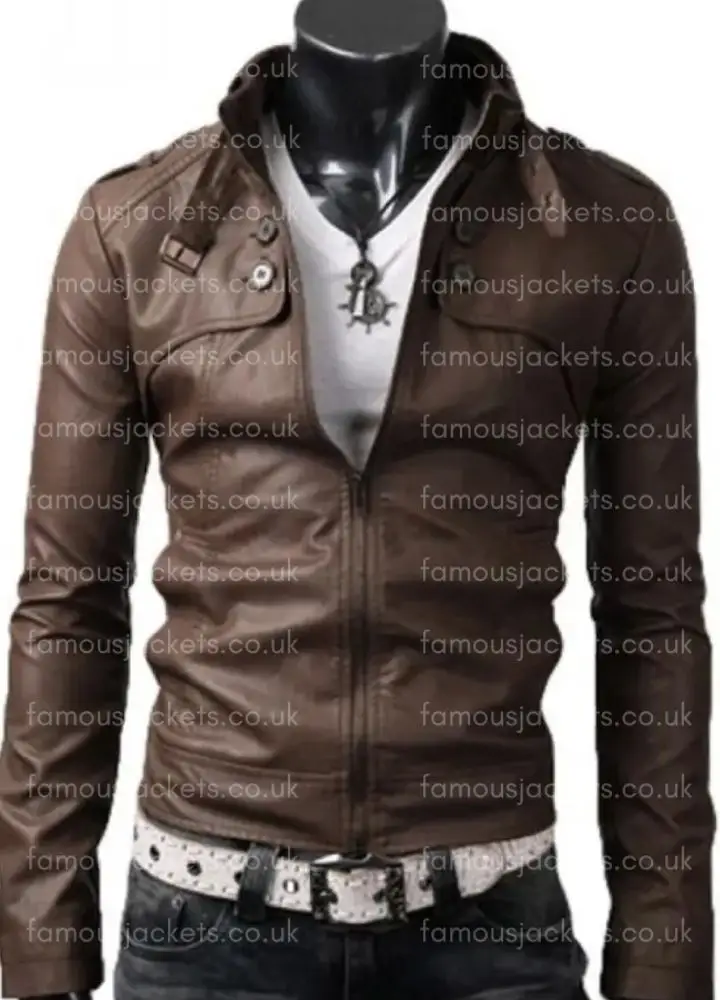 Belted Buckle Collar Slim Fit Brown Leather Jacket For Men