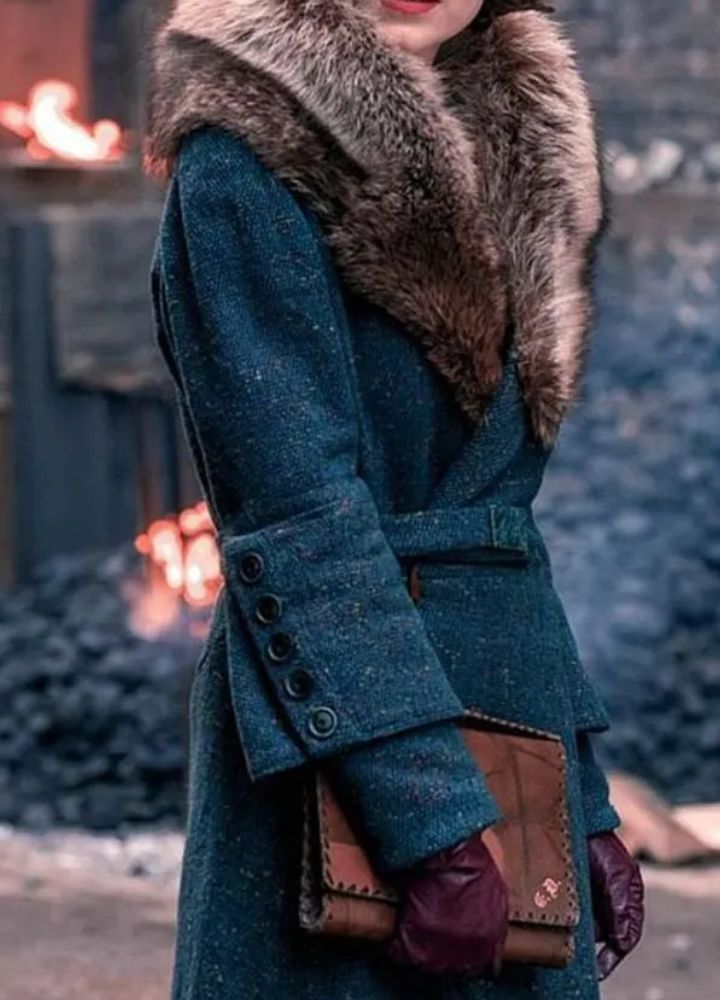 Therefore, simply put, this is how to achieve the sophisticated, classy look that Ada Shelby from “Peaky Blinders” would sport: wear the coat over a well-tailored black dress or fitted skirt, somewhat sheer tights, and ankle boots. Coupled with the superb neck fur, this will hype an air of refinement to your outfit. Afterwards, you can accessorize with a brooch or perhaps a pendant necklace in vintage style. Be it a formal event or a simple walk in town, wear this coat and feel like a full-blown member of the Shelby family with this timeless and elegant design.