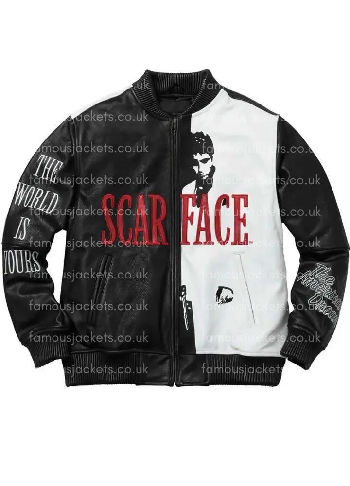 Inspired by the 1983 classic Scarface, this Scarface Al Pacino Tony Montana Bomber Jacket brings out the bold and fearless personality of Tony Montana which Al Pacino’s character was known for. In the movie this Black & White Leather Jacket was worn during key scenes which represented power, ambition and that timeless gangster style. The Tony Montana Bomber Jacket is more than just a piece of clothing it is a tribute to film history. For classic Hollywood fans this Scarface Leather Jacket puts together retro elements with modern fashion which makes it perfect for casual days, nights out, parties and winter wear. Whether you are going for a movie inspired look or just to give your wardrobe an upgrade this Al Pacino Bomber Jacket has iconic appeal and confidence.