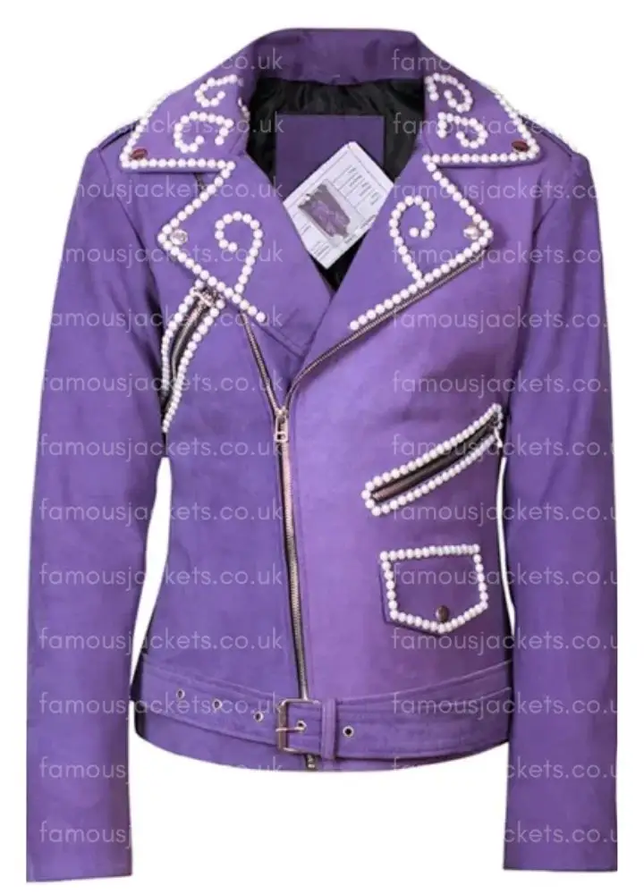 Selena Quintanilla Asymmetrical Zipper Style Moto Purple Motorcycle Vegan Sequin Design Leather Jacket