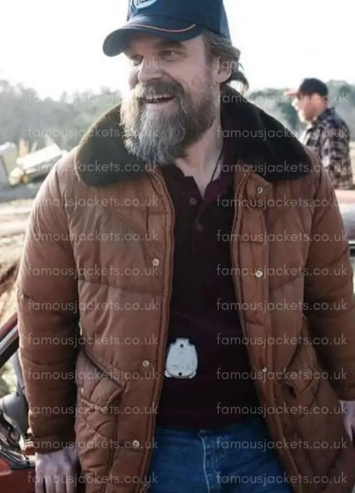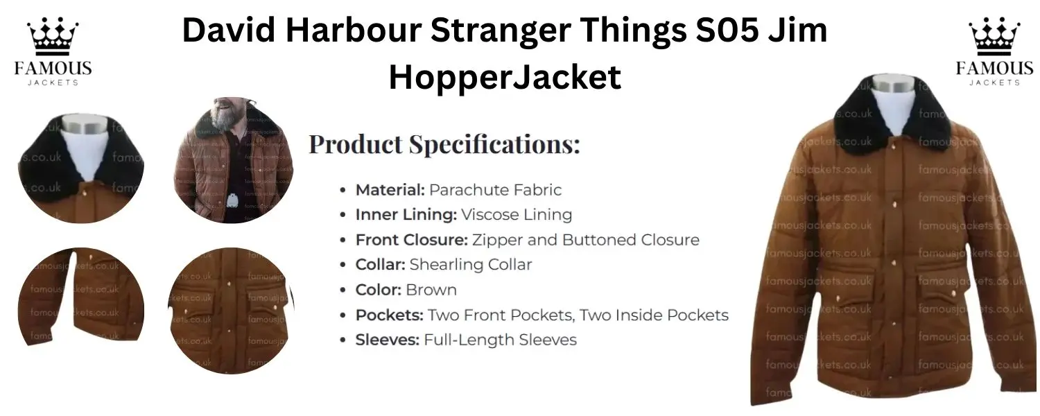 Step into the world of Hawkins with the Jim Hopper Stranger Things S05 David Harbour Brown Shearling Jacket that pays homage to the iconic character of Jim Hopper. In Season 5 of Stranger Things, we see Jim Hopper emerge as the brave and rugged protector of Hawkins, which he does with determination and style. Now, we fans can add to that look with this premium David Harbour Jacket, which was designed for authenticity and comfort. Made from high-quality parachute fabric, this Jim Hopper Brown Jacket also includes a soft shearling collar, full-length sleeves, zip and button front closure, two front pockets and two inside pockets for convenience. The inner lining is of smooth viscose, which not only adds to the jackets warmth and durability but also makes it perfect for casual wear, cosplay events or for that Stranger Things S05 theme party.