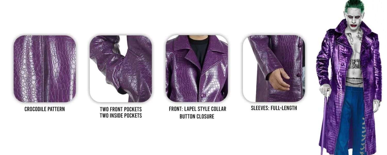 The Joker purple coat exceeded my expectations; the crocodile pattern is realistic, and it feels comfortable for long hours of wearing.