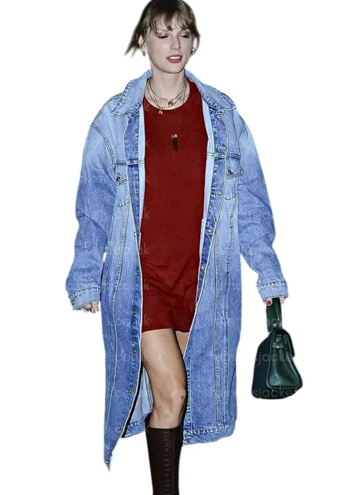 The Taylor Swift Denim Long Coat will take you to centre stage-imagine the eyewash-erasing global icon with an Eras Tour styling flair epitome of a dream come true for every fan and fashionista alike. Long blue denim coat representing a smooth blend of damn celebrity styling with streetwear style is surely the ultimate piece to die for in any Swiftie’s Wardrobe. Made of luxurious denim with an extraordinarily soft inner lining to keep you warm and comfortable for winter fashion. It is finished with a traditional shirt collar, front button closures, and buttoned cuffs; this gets a superhero score on the must-have list.