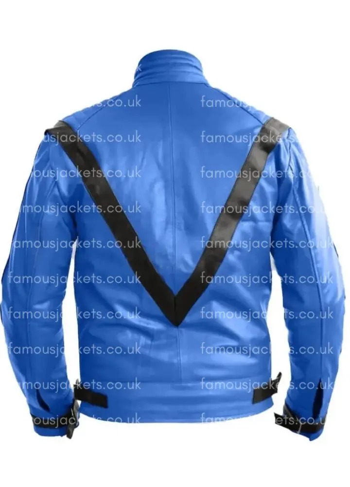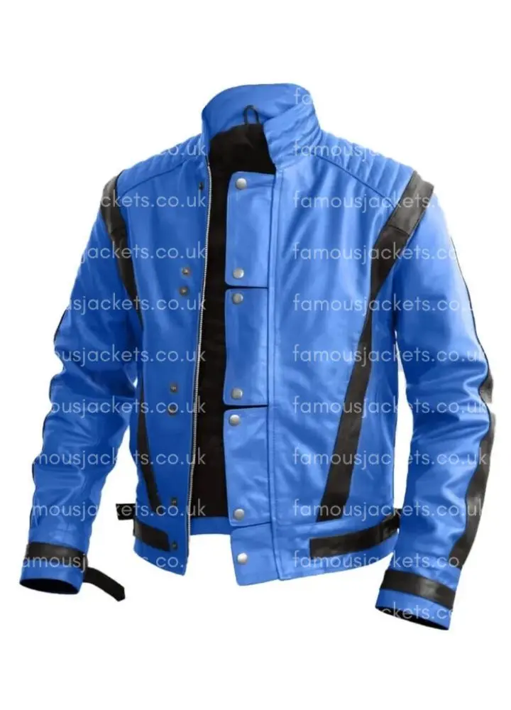 The Michael Jackson Blue Leather Jacket is a stylish and iconic piece inspired by the King of Pop’s legendary look. Made from genuine leather, this jacket offers both durability and comfort with its soft viscose lining. Its vibrant blue color is accentuated by black stripes, adding a bold contrast to the design. The jacket features a front zipper with a snap tab buttoned closure, a stand-up collar, and full-length sleeves with open hem cuffs, ensuring a sleek and classic fit. Two front waist pockets provide practicality, while fine-quality stitching completes the high-end craftsmanship of this statement piece.