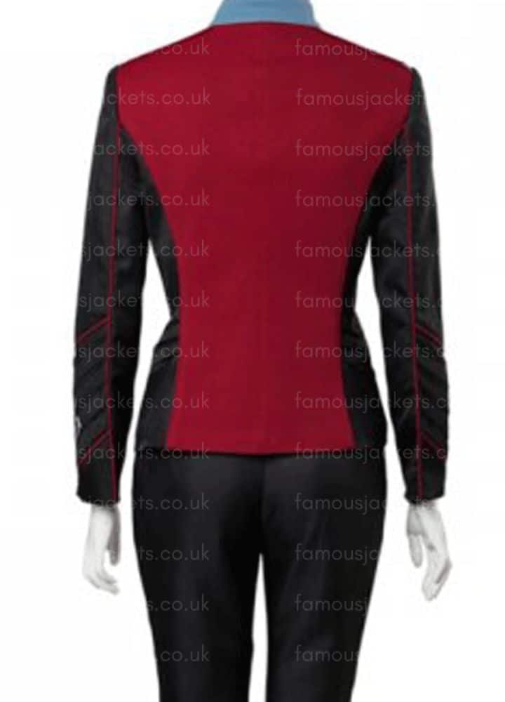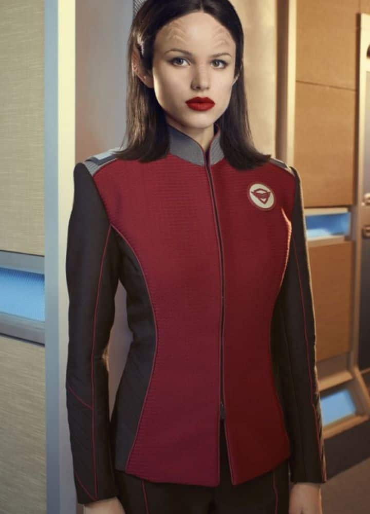 For the diehard fans of the new sci-fi comedy show Orville, who are now getting addicted to the episodes, Lt. Alara Kitan has many fans due to her self-standing character. This member of the Xelayan race can bring down fortifications. Halston gets mesmerizing action from fans, both because of the alien costumes and because of making the Alara Kitan jacket. Alara Kitan top wears this in a unique and unprecedented way because of its specific and unusual Red Piping Details that make it even more polished. It becomes something awesome involving red, gray, and black.