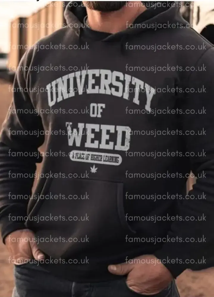 The University of Weed Hoodie that we present combines trend with comfort. Made of high-quality fleece, which in turn provides heat without the bulk. Also, we see to it that the hooded collar, pullover design, and ribbed cuffs give you a fit that is at once secure and loose. Also, the deep brown, black, and white hoodie we chose for this piece adds to its versatility in any wardrobe. Pair it with jeans, joggers, or casual sneakers, and you have a look which is also a statement as it keeps you warm.