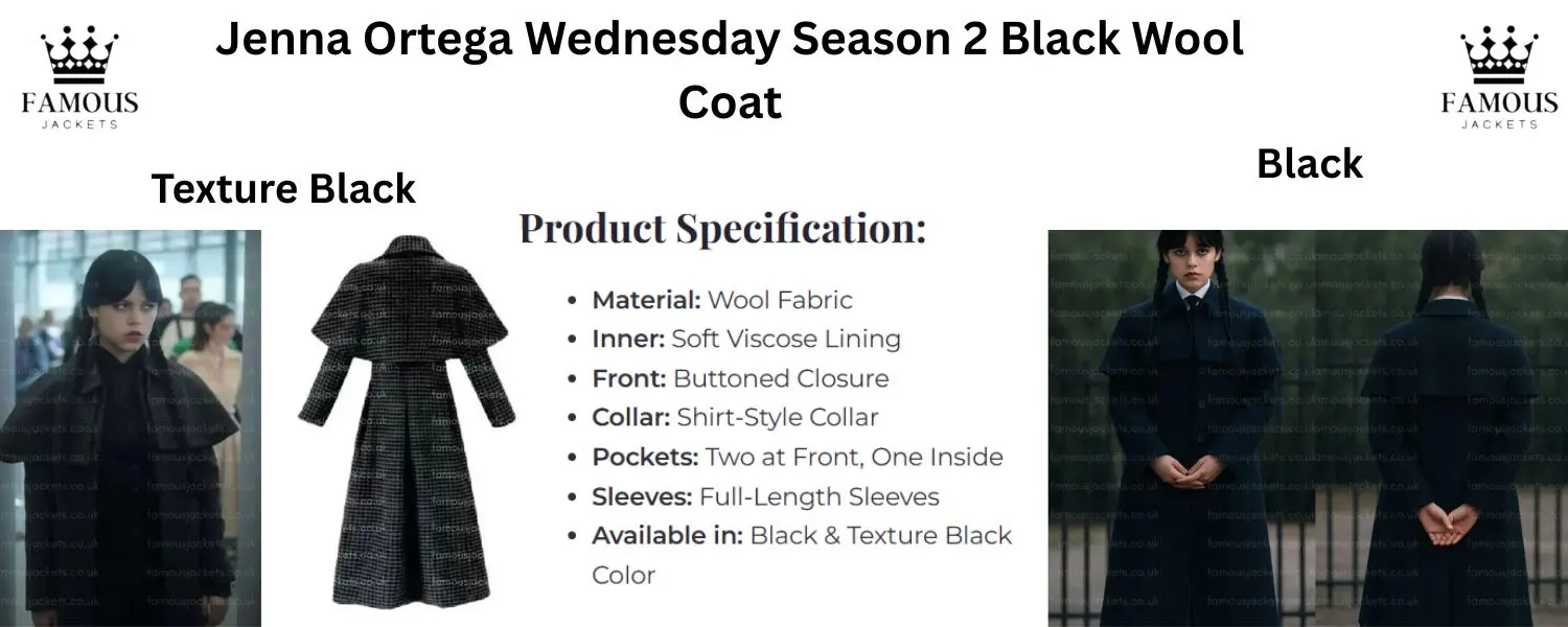 Step into the dark yet trendy world of Wednesday in Season 2, which we present to you via the Wednesday S02 black coat a mix of goth grace and eternal appeal, from Jenna Ortega’s amazing portrayal as Wednesday S02 Costume, which is our inspiration for this black coat, which captures the girl’s strong will and class. From the ghostly halls of Nevermore Academy to her death-defying fashion choices, Wednesday’s style has gone viral, making this black coat a must-have for any Netflix series fan. For cosplay, winter get-togethers, or if you are into that classic goth look, this coat takes your fashion to the next level.