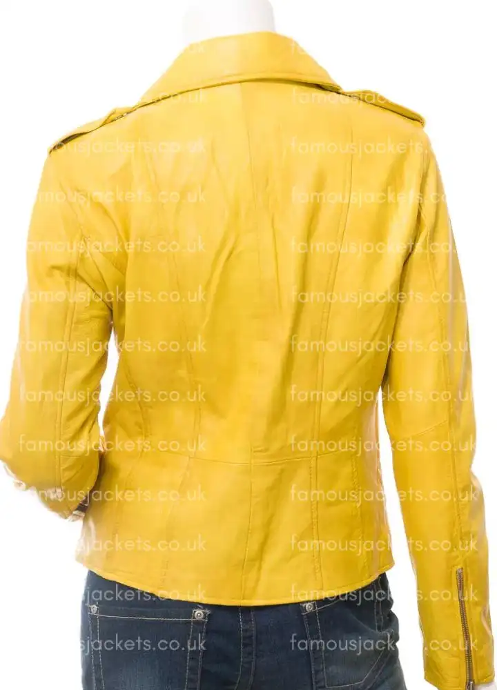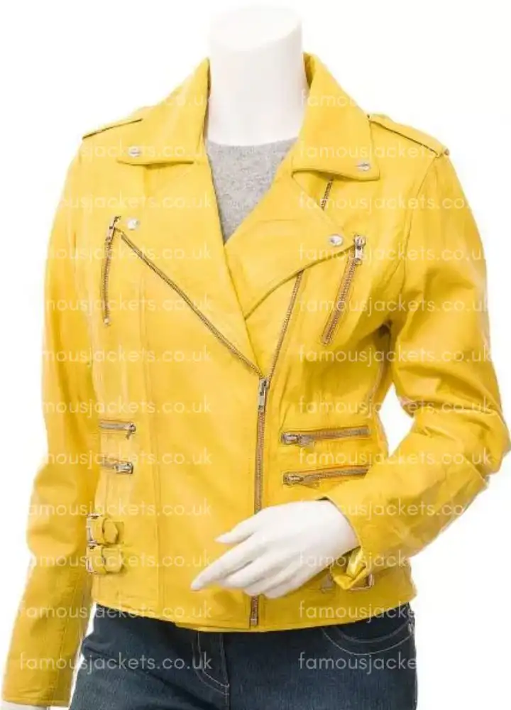 This Women’s Yellow Biker Jacket exceeded my expectations. Soft leather, perfect stitching, and bright color make it ideal for casual or night outings.