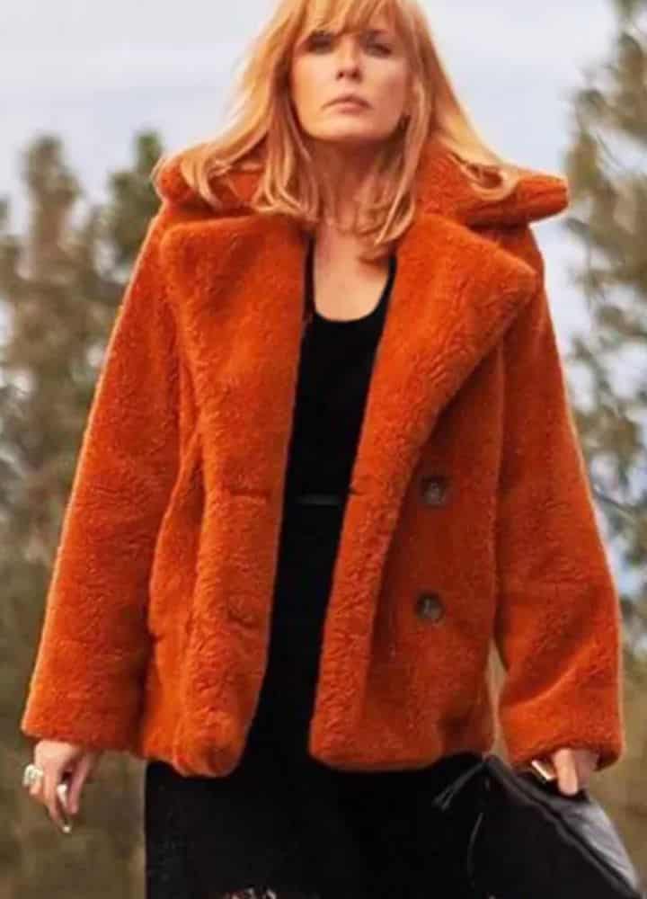 The Yellowstone Beth Dutton Coat is more than just an outerwear piece, as it stands as a pure fashion abstraction about the wilderness and dominating power. As far as the details are concerned, the coat is made of a very durable fur material which gives a very rich and warm look. Its bright orange color is one of the most striking aspects about the coat, being quite audacious as well as interesting, it is a piece which will easily command attention in any wardrobe. However, the inner shearling lining which contains viscose is designed to provide warmth for the wearer on the coldest days, which makes it extremely comfortable to wear. It has the front buttoned closure to keep the user warm and comfortable while full-length sleeves offer warmth to the user. It has a lapel style collar which adds style to the coat and open hem cuffs which give a stylish casual appearance to the coat. Two waist pockets come in hand, carrying things in without hindering the aesthetic of the outfit, and also serve as a fashionable element. This fur coat is fashioned as per the character of Beth Dutton in Yellowstone, which makes it suitable for anyone who loves portraying the strong and fearless women. It can be worn in a casual way with jeans and boots or even thrown over a fancy concepts dress as a bold piece of fashion. This coat with a striking orange color that also has soft and warm inclusions glassy, makes the blending of fashion and purpose easily achieved as one is able to fight the weather with elegance.